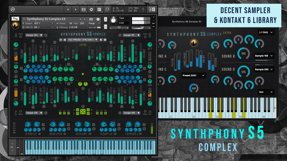 Synthphony S5 Complex is available for Kontakt 6 (Full Version) & Decent Sampler. Kontakt & Decent Sampler are two different Samples Players. You will notice that the output sounds from both players are different as both of their Effects engine is not the same. It will be a good idea to have both libraries installed to complement each other and make them a good combination for sounds and music productions.
